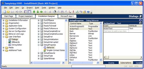 The text field just above the progress bar displays a short description—“Copying new files”, in the previous figure—of the action currently taking place. The text field is set up to display these short action descriptions by “subscribing” to the ActionText event with the attribute Text. In the following figure, note that the Subscriptions tab is selected in the lower right region of the behavior editor for the selected text control.