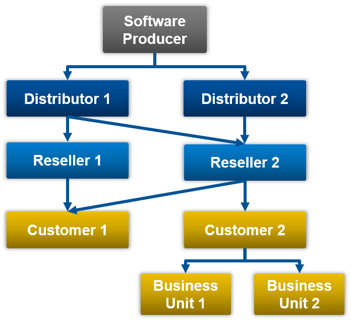 First of all, make sure you manage your channel organization in your entitlement management software system so that you can track and measure performance and manage the relationship between you as the producer, your partner ecosystem – single or multi-tier – and end customers. The structure shown in the figure is something we see quite often and obviously it gets more complex in real life.