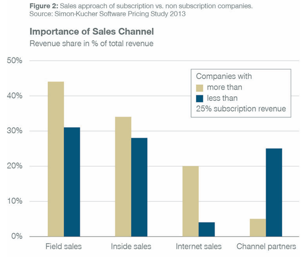 Subscription businesses rely much more heavily on field, inside and internet sales, while external partner sales become less relevant. This closer control of the sales process also involves hiring more personnel to meet that challenge.