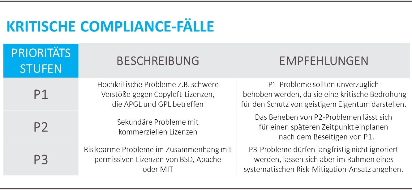 Rund 17% der Treffer wurden als kritische Compliance-Risiken (Prioritätsstufe 1) eingestuft, die damit ein unmittelbares Risiko darstellen und ein schnelles Handeln erfordern. Dazu gehören u.a. schwere Verstöße gegen Copyleft-Lizenzen, die APGL und GPL betreffen. Weitere 5% der entdeckten OSS-Fälle fielen unter Prioritätsstufe 2 (z. B. sekundäre Probleme mit kommerziellen Lizenzen). 76% der Ergebnisse entsprachen der Prioritätsstufe 3, darunter risikoarme Probleme im Zusammenhang mit permissiven Lizenzen von BSD, Apache oder MIT.
